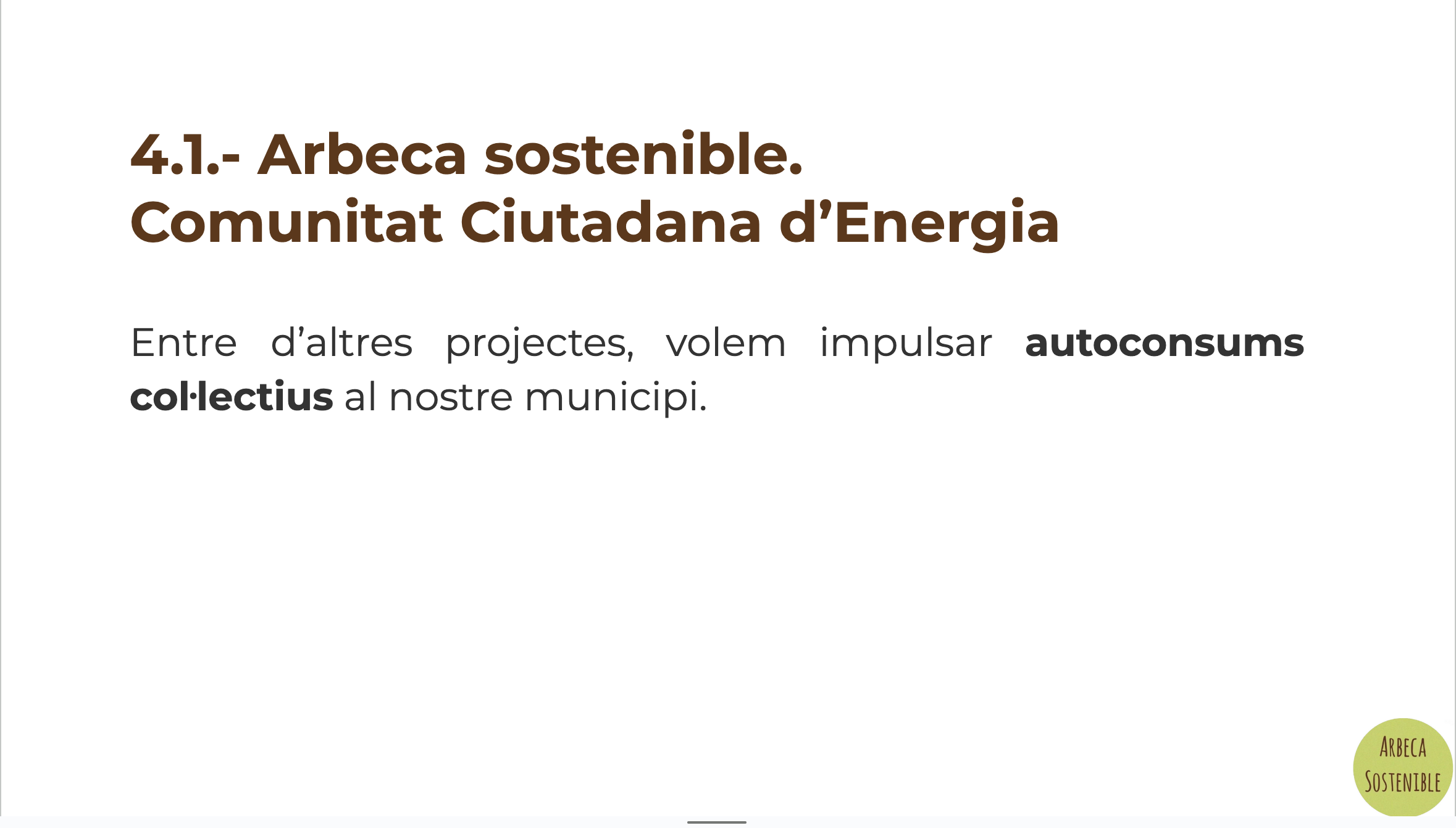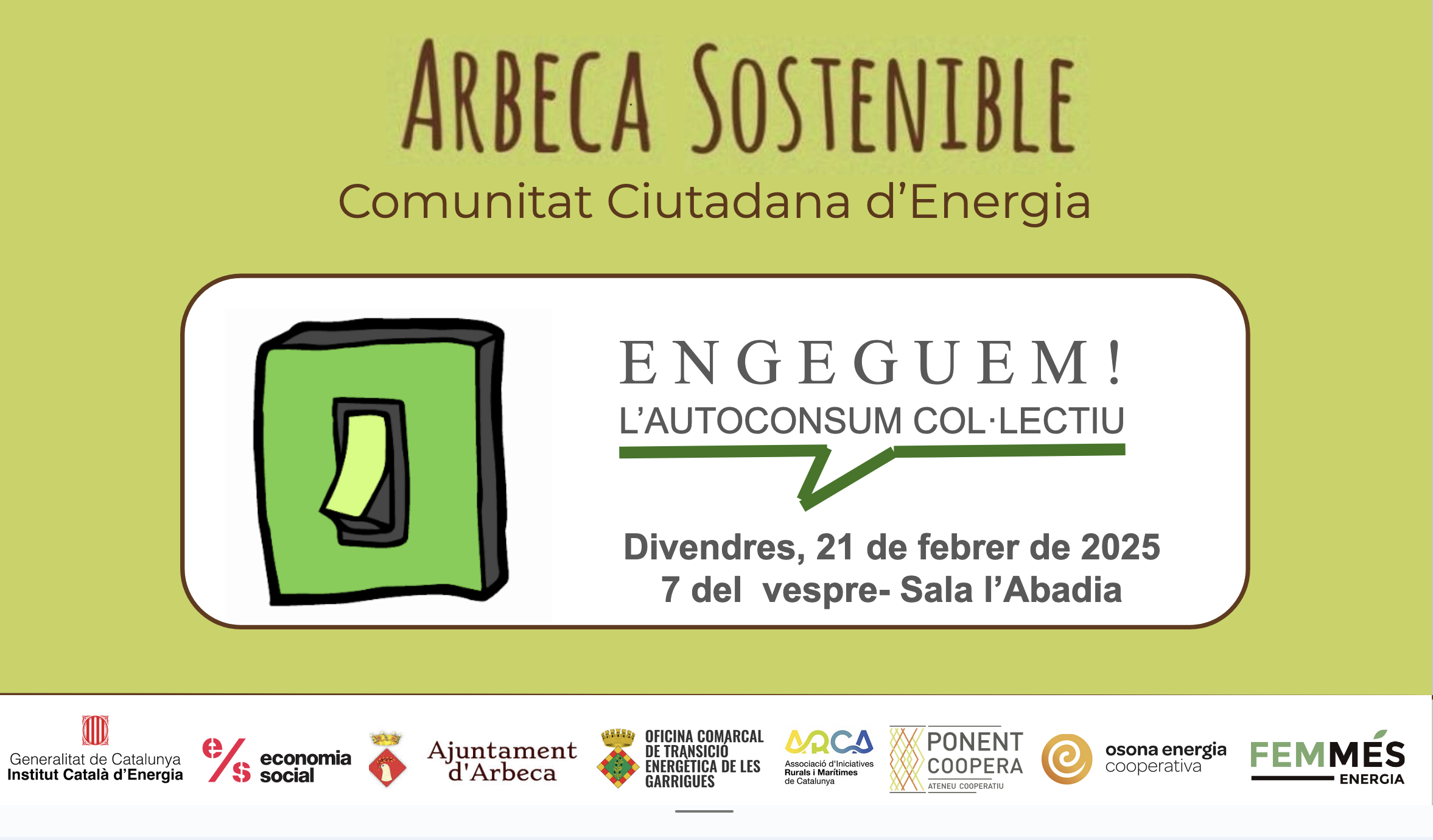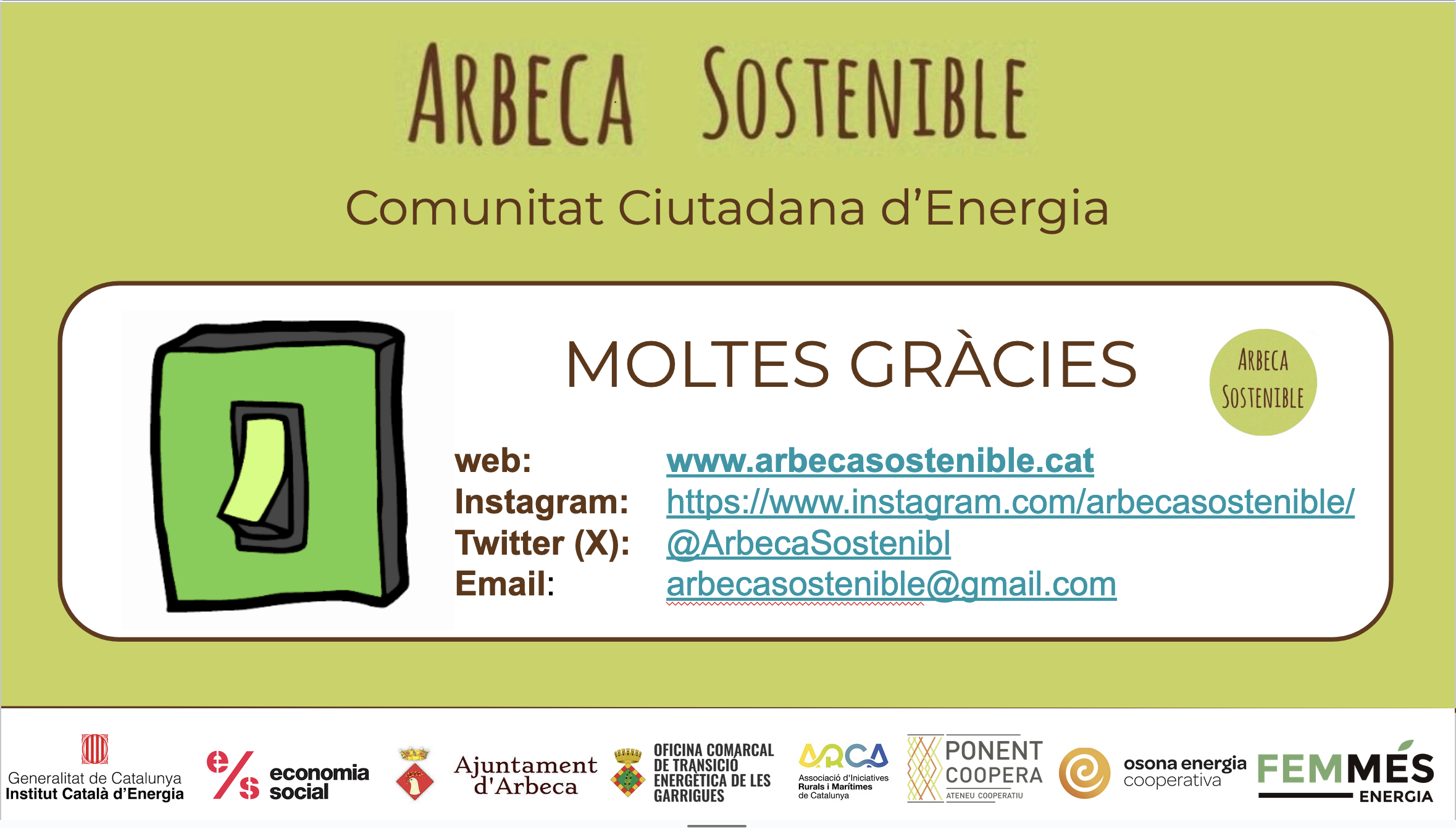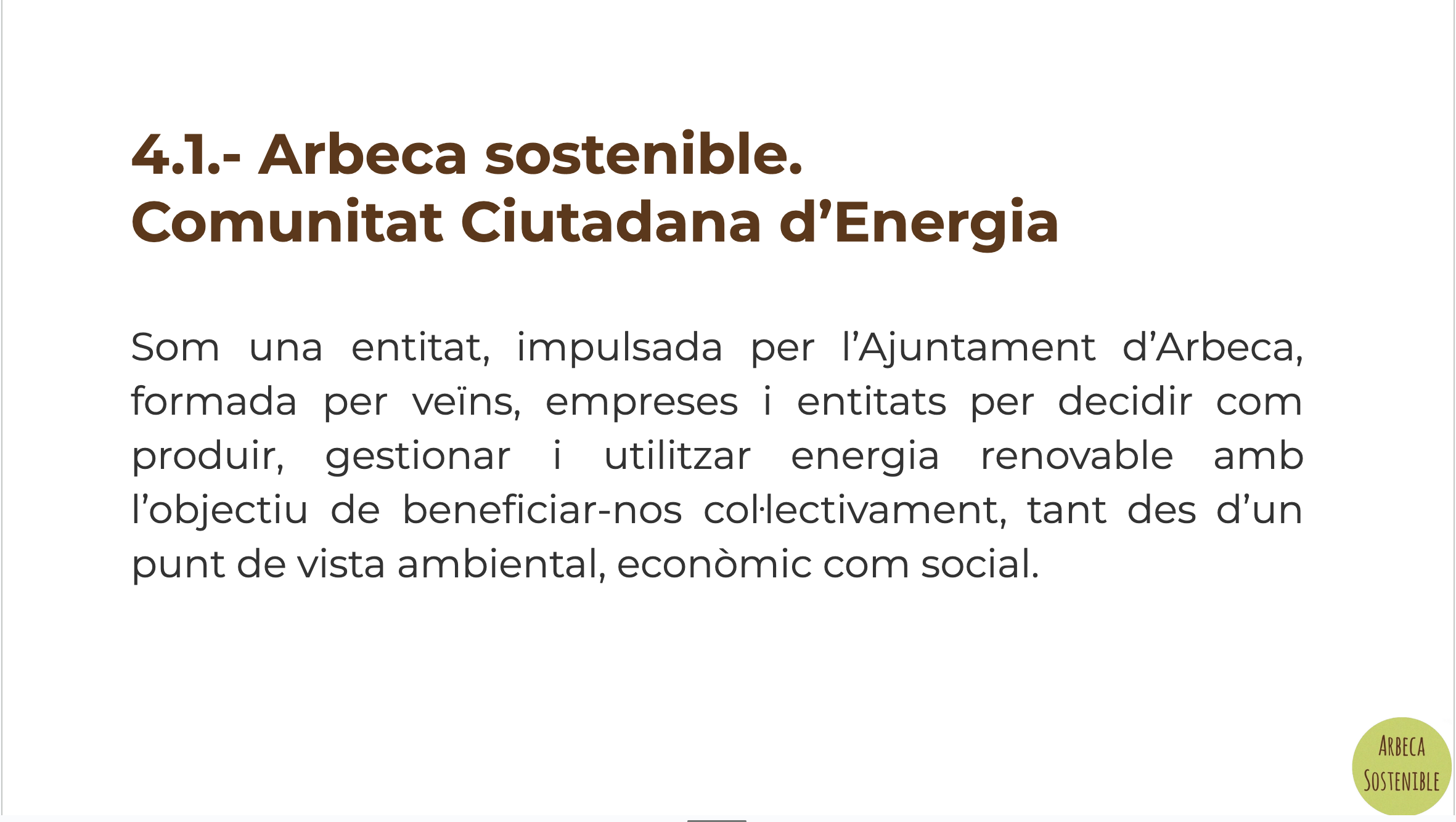 Som una comunitat ciutadana d'energia en forma de cooperativa que desenvolupa la seva activitat bàsicament a la vila d'Arbeca.