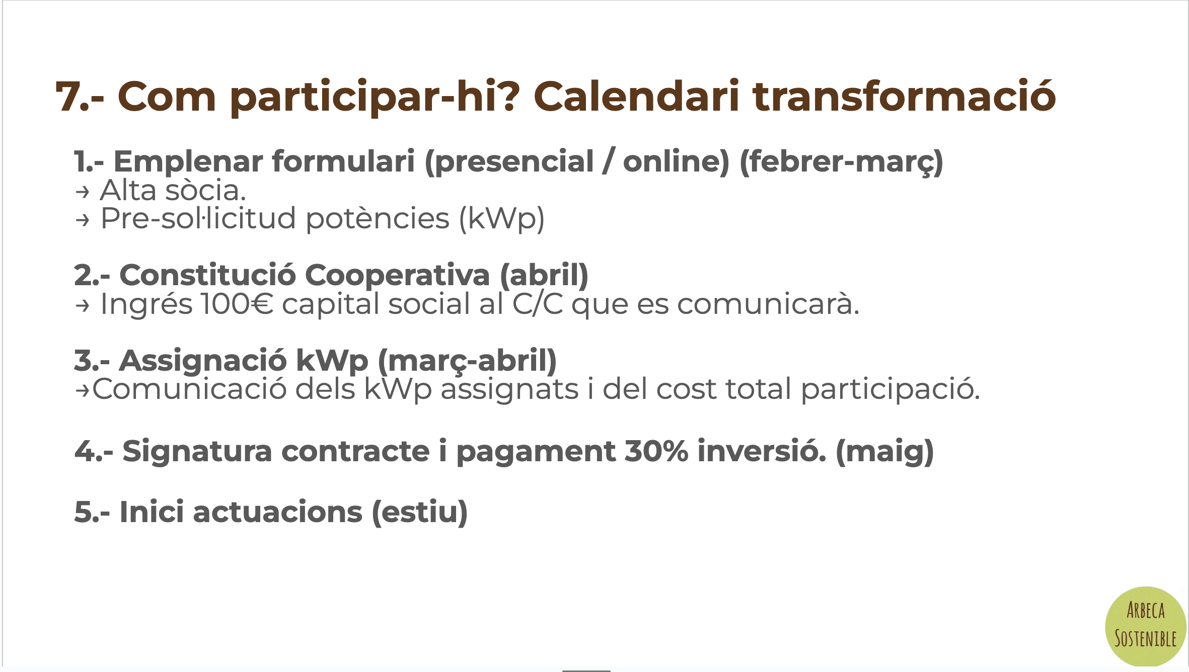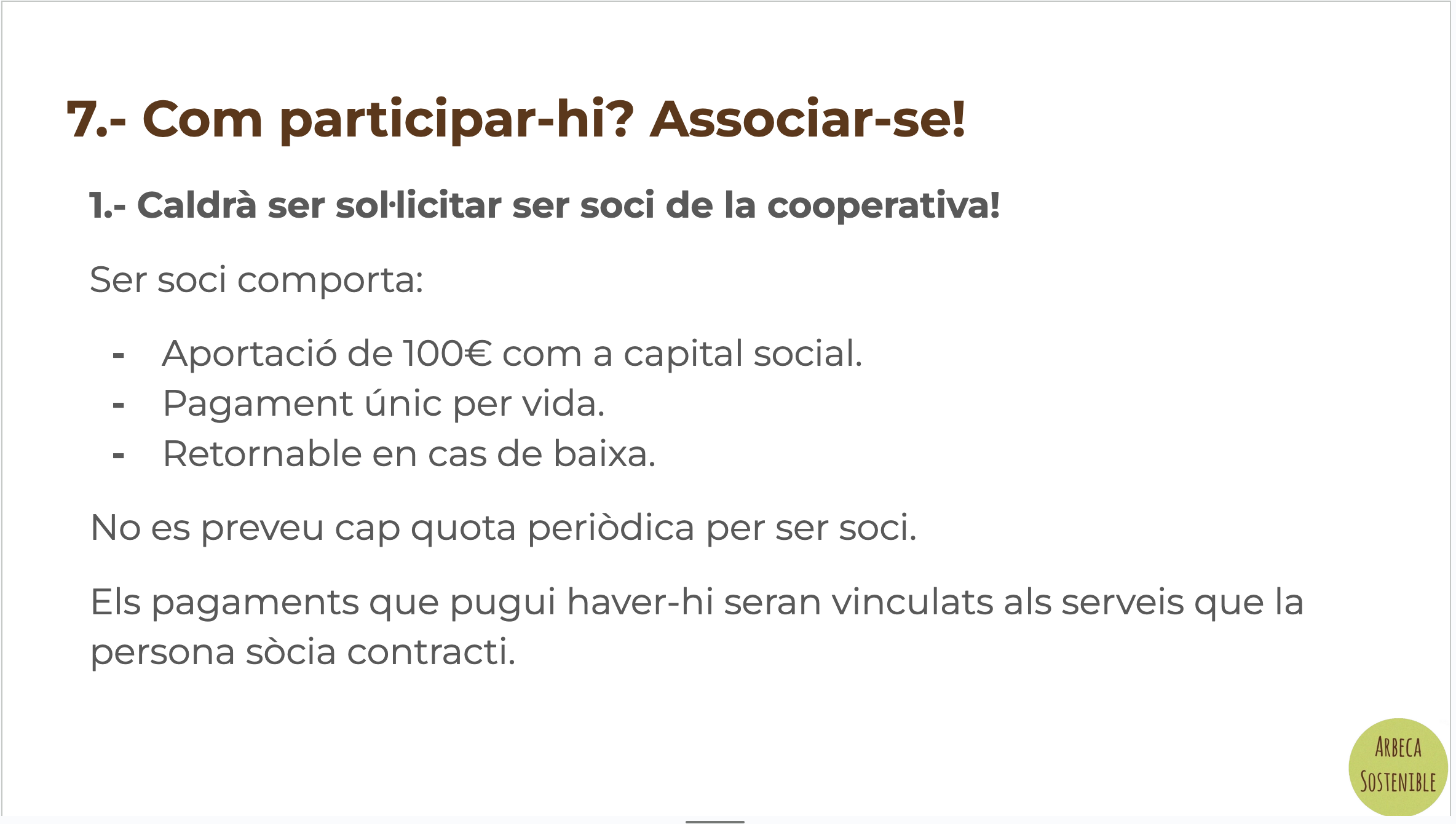 Pot ser soci/a de la cooperativa qualsevol persona particular, empresa, associació, fundació, entitat, administració pública, etc, interessada en col·laborar en la Transició Energètica del nostre municipi.